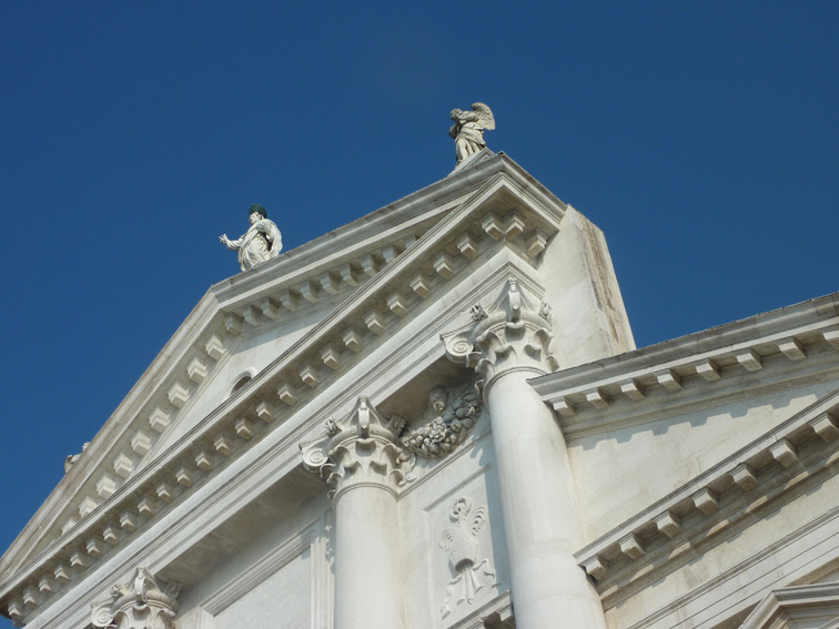 Palladio : un génie universel. Il travaille tout d'abord à la réédification du monastère de San Giorgo Maggiore (dès 1565), dessinant le cloître des Lauriers et le réfectoire, puis l'église. La façade, qui depuis le môle, complète si bien le panorama du bassin de San Marco, est la première d'un style qui sera souvent imité : quatre immenses colonnes corinthiennes formant portique, soutenant un fronton, des niches ornées de statues ; le décor, spectaculaire, est créé avec une grande économie de moyens, et il en va de même pour l'intérieur de l'église, très dépouillé. La nef, en croix latine, est surplombée par une coupole à la croisée, et la lumière inonde le sanctuaire. Dans le choeur, deux des oeuvres ultimes de Tintoret, la Manne dans le désert, et la Cène (1594), et de fort belles stalles de bois sculpté du Flamand Albert van der Brulle.